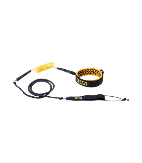 This item belongs to the ION Wingfoil Accessories range. The hybrid designation refers to the combination of a coiled section and a straight line cord. This setup prevents the leash from dragging in the water while keeping it away from your feet during flight. It includes a swivel to stop tangling. The padded neoprene cuff attaches to your knee for comfort.