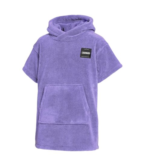 Information found on internet: The choice of material (Teddy Fleece/Polyester) and functionalities (oversized fit, hood, kangaroo pocket, focus on Kids target group, and absorption/warmth retention) are derived from the standard specifications of the Mystic Teddy Poncho line, combined with visual characteristics (color Purple, short sleeves). Item number 35018.240420 was used for reference to confirm the specific model.