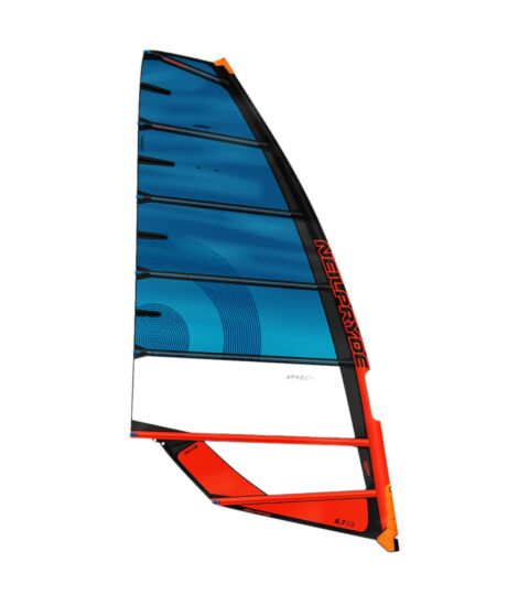 The Neilpryde Speedster 2026 is designed for windsurfers who want to combine the speed of a slalom sail with the ease of use of a sail without cambers. These blue (blue with orange accents) Windsurfing sails, Freeride sails are suitable for intermediate surfers as well as pros. The seven slats provide a stable profile that allows you to maintain control while sailing in strong winds.
