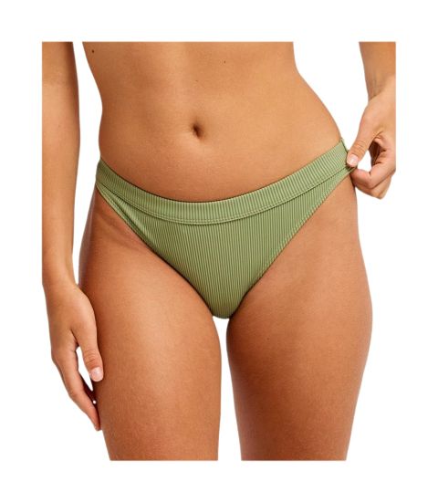 The Roxy Roxy LOVE from the 2026 collection is a functional item within the Women's Apparel, Bikinis category. This bottom in the color green (sage) is made from a ribbed fabric of recycled nylon and elastane. It has a high leg fit and is specifically designed for active water sports and beach wear due to its close-fitting stretch. The technical composition offers optimal freedom of movement while surfing.