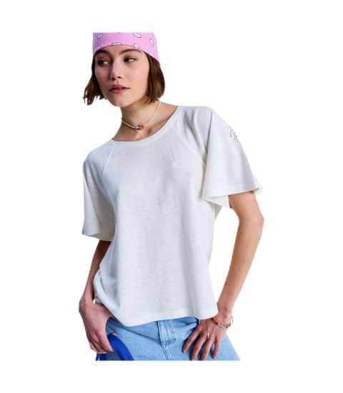 Information found: Roxy product page (ERJKT04275), 100% cotton slub jersey, relaxed fit, raglan sleeves, crew neck, embroidery details, collection 2026.