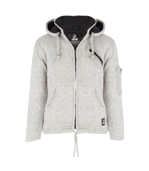 This light gray cardigan is handmade in Nepal from 100% New Zealand sheep's wool and has a soft fleece lining for extra comfort. The vest features kangaroo pockets on the front, two zippered pockets on the chest and left arm, and a lockable inside pocket. The zip-off hood adds versatility. This warm vest is available in a variety of natural colors and sizes from S to 5XL. Simply wash it at 30 degrees with wool detergent and enjoy the quality.